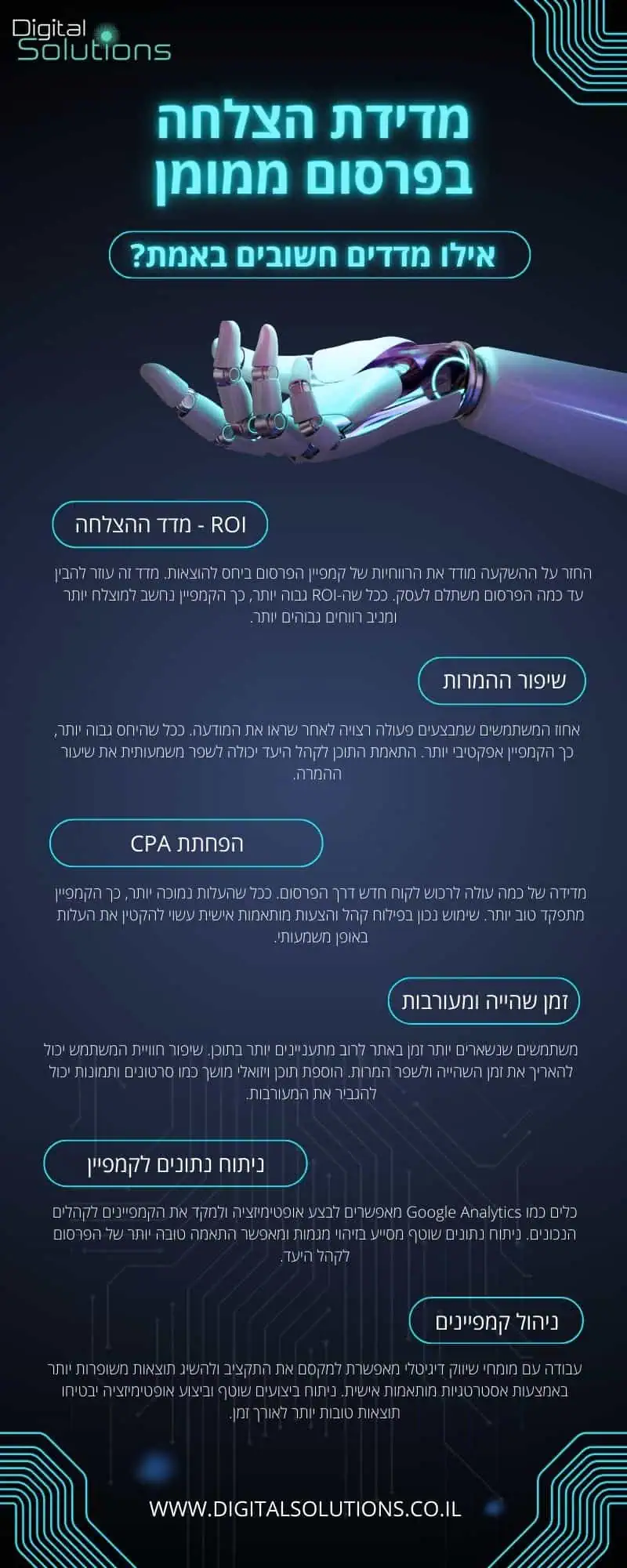 | ROI (החזר על ההשקעה) | מדד המציין כמה הכנסות נוצרו עבור כל שקל שהושקע בפרסום. ככל שה-ROI גבוה יותר, כך הפרסום רווחי יותר. | ביצוע אופטימיזציה למודעות, התאמת המסר לקהל, שימוש בבדיקות A/B, צמצום עלויות לא הכרחיות והשקעה בערוצים עם החזר גבוה. |
