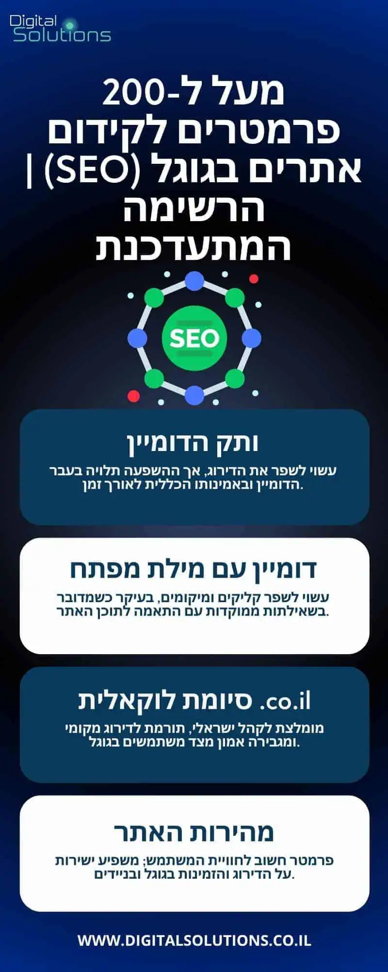 | מילת מפתח בדומיין | מוכח | רלוונטיות גבוהה יותר לשאילתות חיפוש | משולב עם מיתוג ברור |