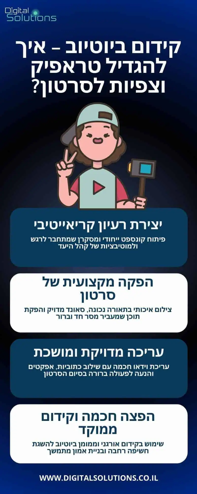 בקידום ביוטיוב, Digital Solutions משלבת יצירתיות, טכנולוגיה וחשיבה אסטרטגית כדי להוביל עסקים להצלחה אמיתית בדיגיטל. אנו מציעים מעטפת שירותים מלאה הכוללת בניית אתרים, קידום אורגני וממומן, ניהול מדיה חברתית, יצירת תוכן ממוקד וניתוח נתונים – כל זאת בהתאמה אישית לצרכים ולמטרות העסקיות שלך. בעזרת שילוב נכון של תוכן איכותי ואסטרטגיית קידום חכמה ביוטיוב, נעניק לעסק שלך יתרון משמעותי בשוק התחרותי של היום.