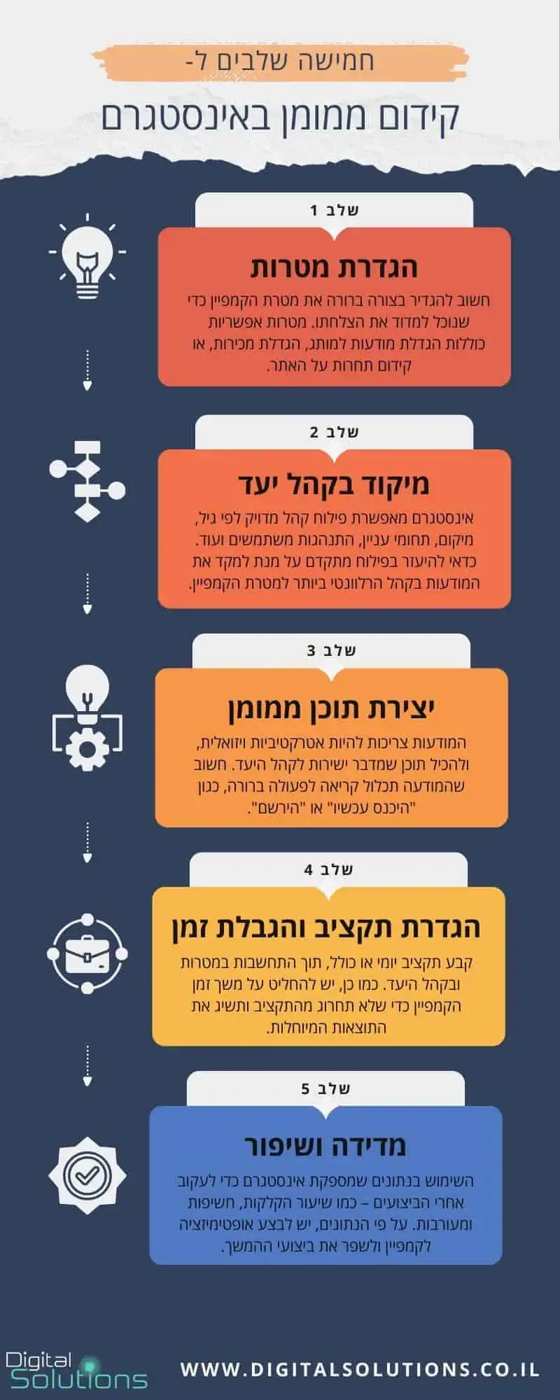 החליטו מה היעד שלכם – הגדלת כמות העוקבים וחיזוק המותג שלכם, הגדלת התנועה לאתר האינטרנט או יצירת קשר ישיר עם הלקוח ופיתוח מערכת יחסים עם הלקוחות. בהתאם למטרת הקמפיין, תוכלו לבחור בכפתור הנעה לפעולה שתפקידו להניע את הגולשים לבצע את הפעולה שאותה אתם מעוניינים להשיג.